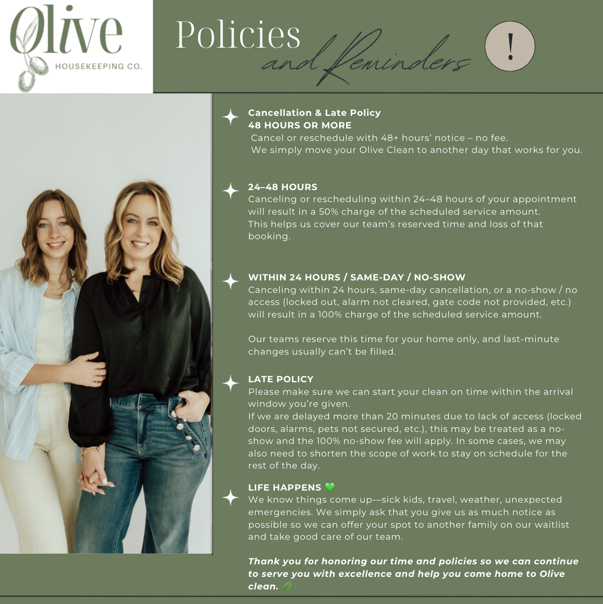 Our promise is that when we leave, you should be able to truly “come home to Olive clean.”